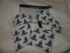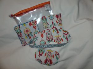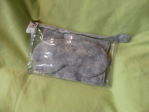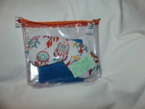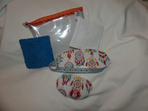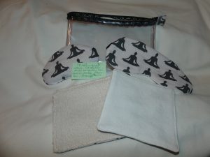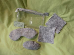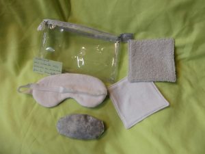 Trousse « Bien être » : elle comprend une trousse, un masque, deux lingettes démaquillantes et une « chauffette ».
